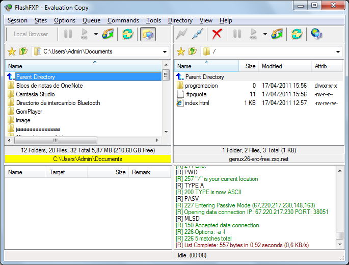 12.- Una ves terminado el proceso anterior uds pueden entrar a la pagina de su hosting mediante el navegador y veran todos los archivos que acaban de subir. Como algo adicional les dire que este cliente ftp tiene mayor ventaja con respectos a las anteriores en poder permitirme hacer fxp como lo mencione anteriormente, el fxp es la conexion de dos servidores directamente y poder gestionarlos al mismo tiempo en la siguiente ventana veran que ambas ventanas estan conectadas a uns servidor ftp diferente y podemos archivos de un servidor a otro, y uds se preguntaran para que me sirve esto bueno si se hacen esa pregutna entocnes pensare que no les interesa mucho el tema de seguridad informatica, bueno les dejo a su criterio utilicen su imaginacion ...